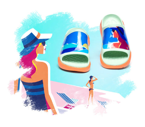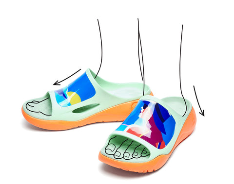 Die unregelmäßige, faszinierende Form des Musters macht Ocean Breeze zu einer einzigartigen Wahl, die es wert ist, in Betracht gezogen zu werden. Die gedämpften Farbtöne des Hintergrunds strahlen lebendige Sommergefühle aus, während asymmetrische Muster eine Verbindung zu moderner und angewandter Kunst herstellen. Der Ocean Breeze ist nicht nur eine belebende Alternative zu lässigen Hausschuhen, sondern auch ein starker Blickfang und Gesprächsstarter!